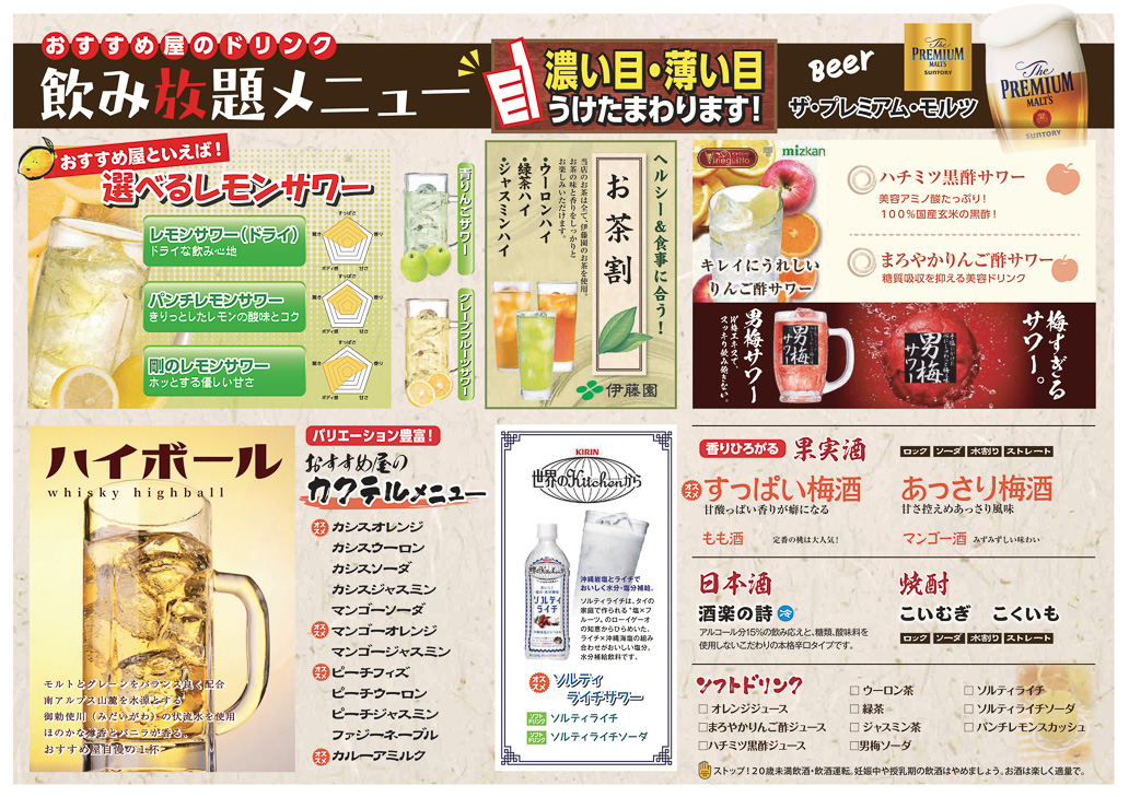 ※生ビール付きの飲み放題は+200円(税込)となります。